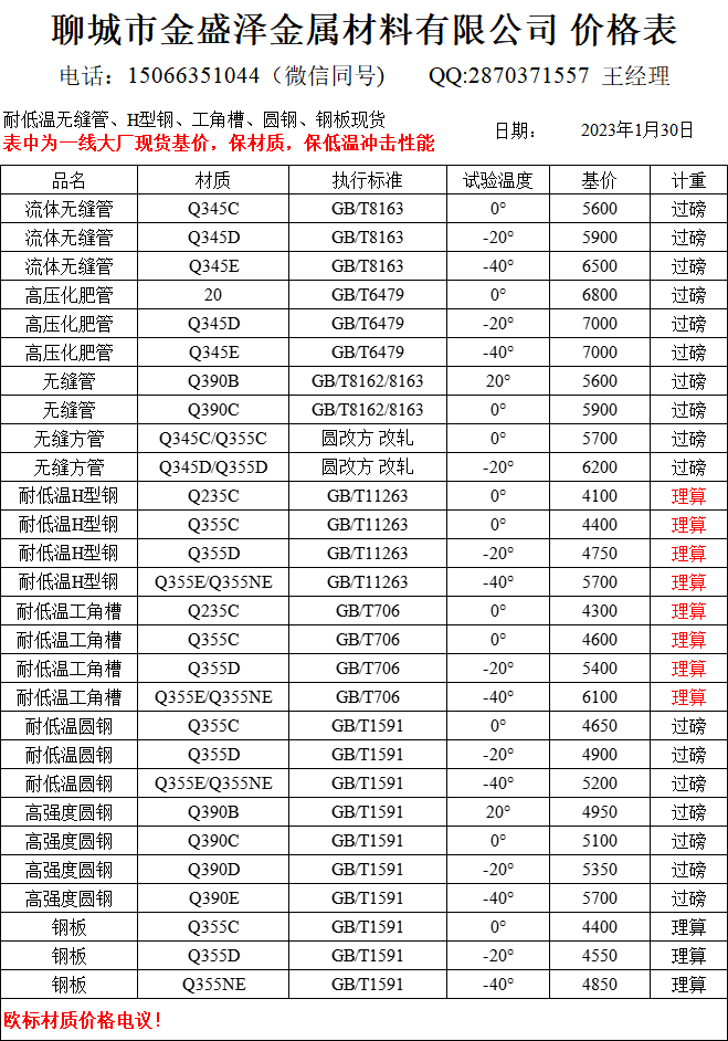 聊城市金盛泽金属材料有限公司主营低合金/耐低温无缝管,方矩管,H型钢,工字钢,角钢,槽钢,圆钢,钢板;现货供应:大无缝、包钢、烟宝、凤宝正品耐低温无缝管,专业加工生产无缝方矩管;经营一线品牌型材:莱钢/包钢/马钢/日钢 耐低温Q235B/C;Q355B/C/D/NE H型钢(100*100-1000*300) 偏型号H型钢钢现货:250/255,248/124,344/348,394/398,506/201,606/201,458/417,912/302,692/300,792/300 ;莱钢/马钢/宣钢产 耐低温槽…